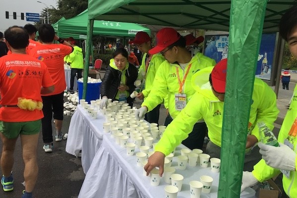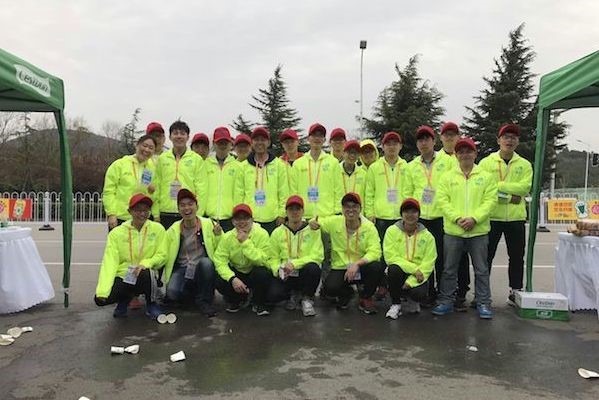 机电工程学院在赛道旁设有独立的补给站,35位志愿者分别负责17.5公里处补给站的补给工作与18.4公里分流处及半程折返点的引导工作。早上5;40,志愿者们集合完毕后分别前往各自的工作点,提前准备站点所需物资。8;00整,马拉松正式开始,补给站的志愿者及时为运动员们提供水、水果及能量补充物,分流处的志愿者则站在自己的岗位上为运动员引路,并且做好卫生工作。