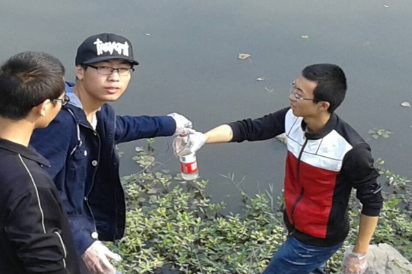 经过前期充分调查准备,乘坐公交历经2小时来到小周屯。在小周屯附近询问当地的百姓,通过热情的村民的介绍,了解到经过这两年的治理,七里河水质情况有了很大的改善,河水变得清澈无味。看到大妈对河水水质的满意情况,鼓舞了全体成员。活动期间,分别在时代大道前七里河,九里湖和华美热电附近进行水样采集,测出其PH、水的硬度、亚硝酸盐、溶解氧等多项指标,并进行数据统计和计算,进行比对常规生活污水标准,最终得出小周屯附近水域水质情况良好的结果。