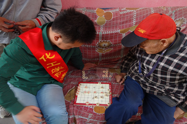 下午14:00来自化工青协的8位青年志愿者在南湖校区集合完毕,带上事先为老人准备的水果,一行人满怀热情的骑行至汇康敬老院。志愿者们到达敬老院后首先向院内工作人员指明了来意,随后在工作人员的陪同下来到了老人的居住区。此时老人们大多坐在院子里晒太阳,看到志愿者的到来,老人们显得格外高兴,志愿者们也热情的与老人们聊起天来。同时志愿者们将事先带来的水果分给老人们,有的老人没法自己剥开果皮,志愿者们则细心的为老人剥好送到老人手中。在听说有的老人很喜欢下象棋后,志愿者们热情地邀请老人“切磋切磋”。活动进行到16:30,考虑到老人们年岁已高,为不影响他们休息,志愿者们向老人们挥手告别。临别时大家都显得有些不舍,志愿者们承诺不久后还将重返这里为老人们献上精彩的节目。老人们听后仍旧有些不舍,一直目送志愿者们到院门口。